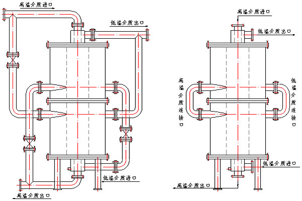 Ⅲ型簡圖 2、可拆式Ⅲ型可兩臺立式組合安裝,并聯(lián)或串聯(lián)運行(如下圖),減小安裝位置,可提高冷凝效果,加大被加熱介質(zhì)使用溫度。